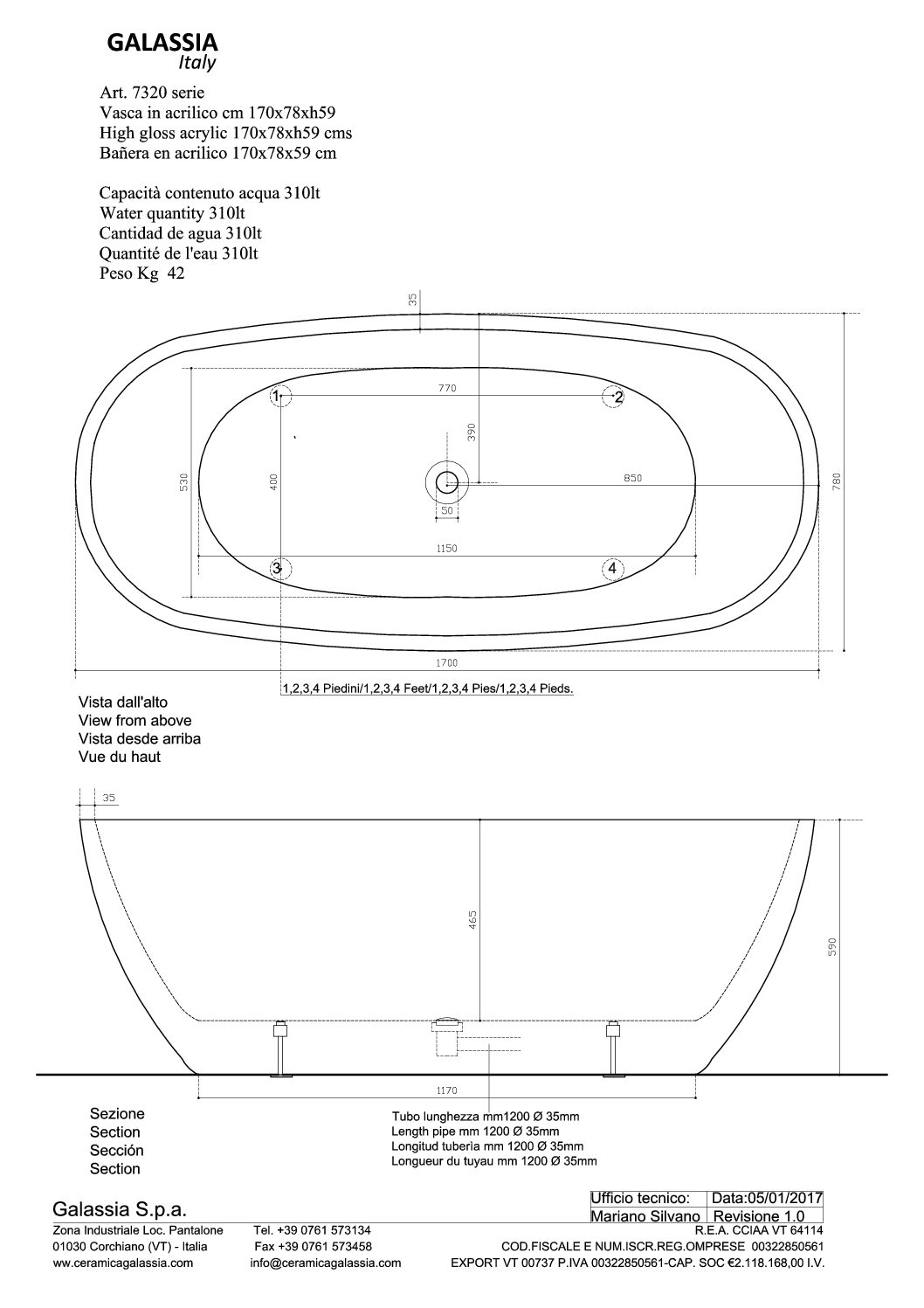 Vasca Flow in puro acrilico 170x78x59h cm. Con piletta click clack e troppo pieno.