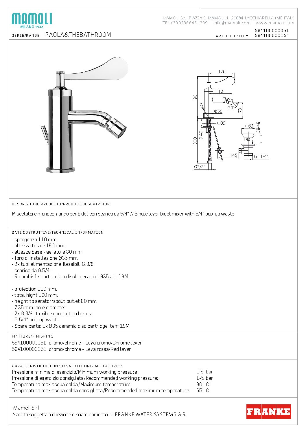 Miscelatore monocomando per bidet con scarico da 5/4''. Leva rossa (nella foto la leva è cromata).