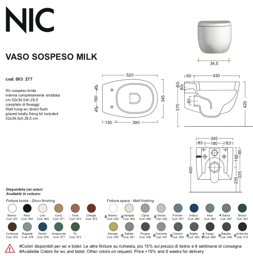 Vaso sospeso senza brida, rimless, completo di fissaggi.