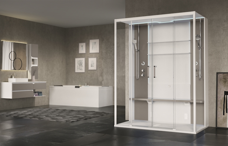 Cabina multifunzione: doppia postazione e sauna di vapore, apertura 2 ante scorrevoli e 2 fisse in linea, con due pareti fisse laterali