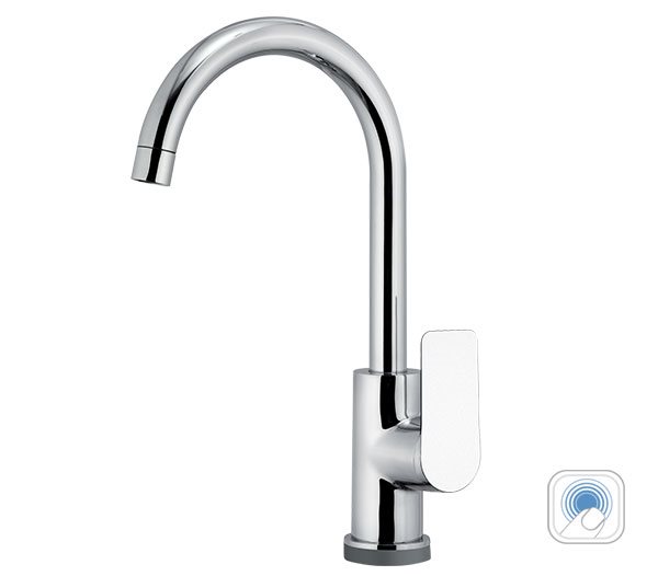 Miscelatore monocomando lavello con tecnologia “touch-me” monoforo 90° con canna alta a “U” girevole e leva laterale. Dotato di cartuccia Ø 35 mm. Disponibile nelle seguenti finiture