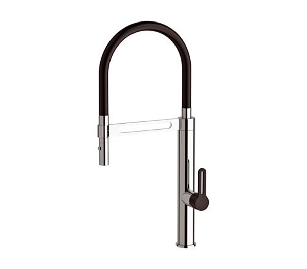 I miscelatori monocomando ELEGANT GOURMET portano un dettaglio di stile nelle cucine più spaziose. Il rivestimento della parte superiore in gomma soft-touch dona un effetto estetico elegante e ricercato, oltre a rendere morbido e confortevole il movimento della doccetta. La doccetta può infatti essere estratta dal supporto ed orientata manualmente per direzionare il getto d’acqua e facilitare le operazioni in cucina.