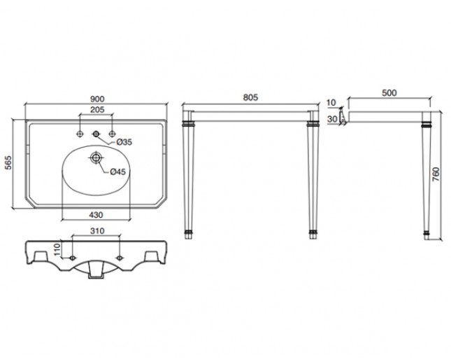 con alzatina 1-3 fori rubinetteria - 900 mm